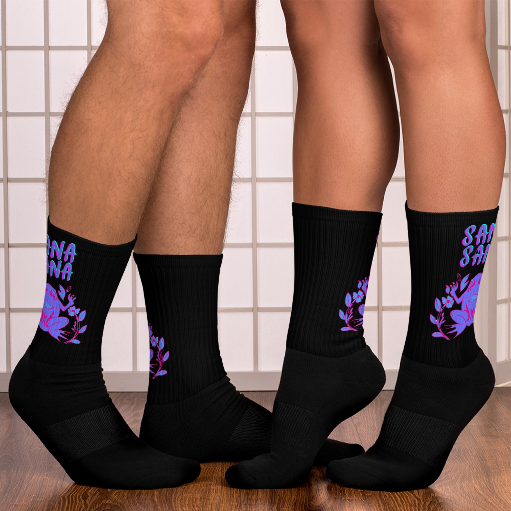 These socks are extra comfortable thanks to their cushioned bottom. The foot is black with artwork printed along the leg with crisp, bold colors that won't fade.