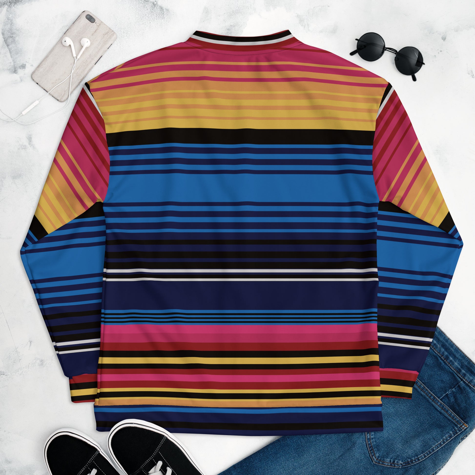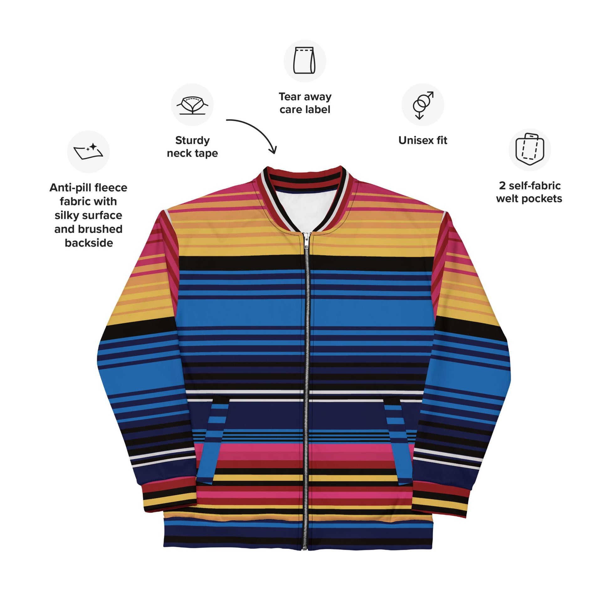 Add a little zing to your wardrobe with this vibrant All-Over Print Bomber Jacket. Wear it on a basic t-shirt, or layer it on top of a warm hoodie—it’ll look great either way. With a brushed fleece inside, and a relaxed unisex fit, this Bomber Jacket is just the stuff of the dreams, so be quick to grab yourself one!